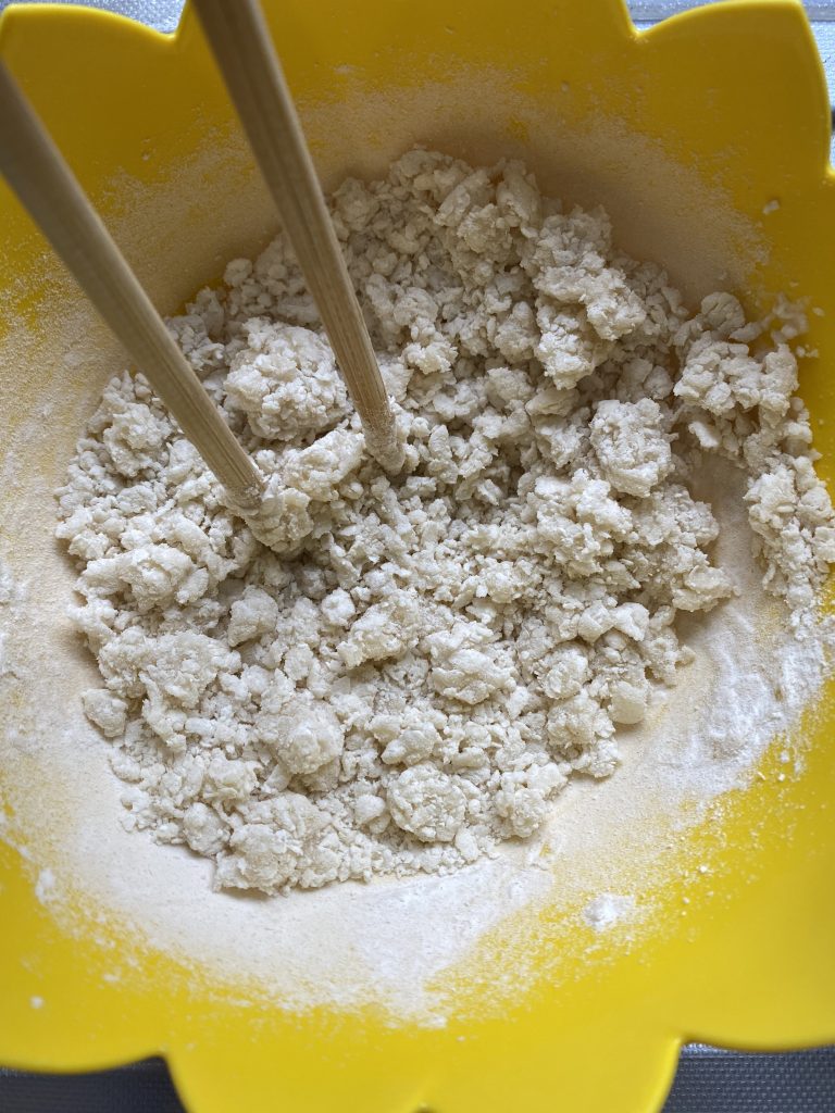 - Placer la farine dans un bol, y verser de l’eau bouillante (50 ml) et mélanger avec des baguettes.