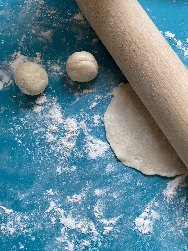 - Sortir les boules du frigo, les allonger à la main (sous la forme d’un cylindre) et couper le cylindre en petits morceaux de 3 cm d’épaisseur. En refaire des petites boules et aplatir ces morceaux au rouleau à pâtisserie. Garder les disques de pâte obtenus sous film plastique.