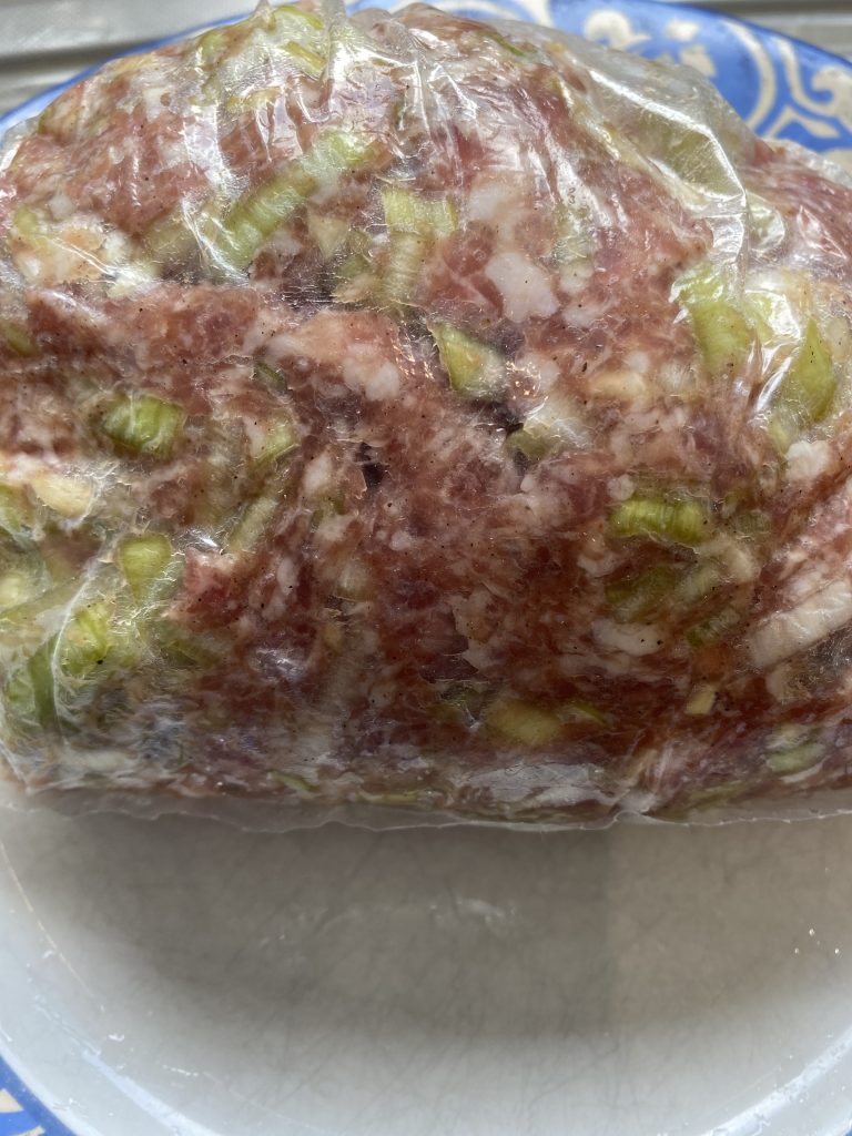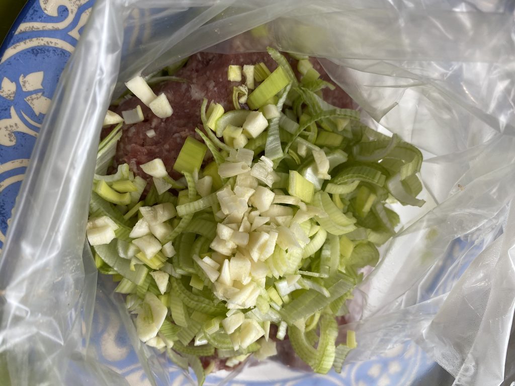 - Dans un sac plastique (de style conservation alimentaire) ou dans un bol, mélanger la chair à saucisse, l’ail et le poireau coupés en petits morceaux. Ajouter le sel, le poivre et la sauce soja et mélanger à nouveau.