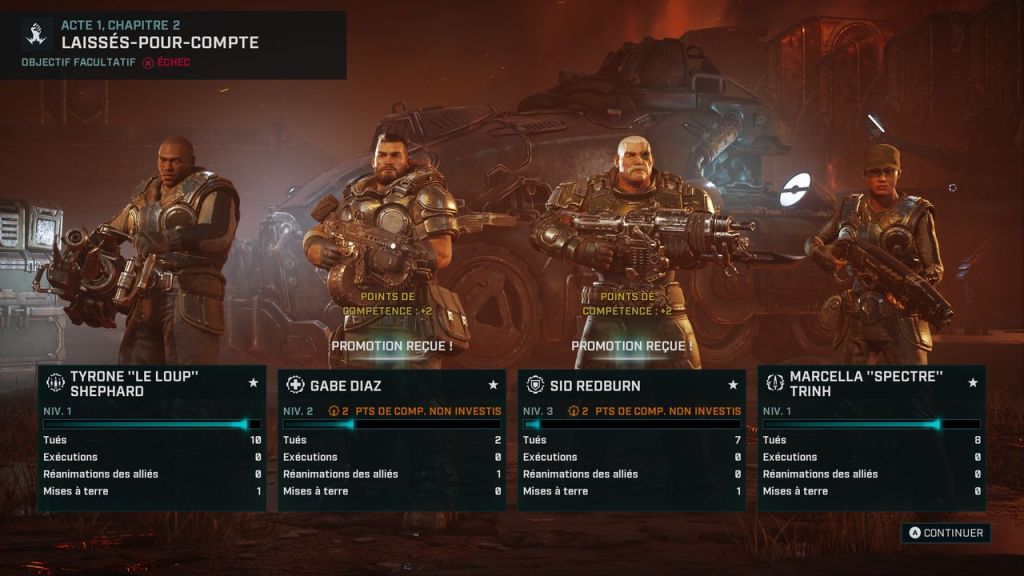 L’histoire se déroule une dizaine d’années avant les événements de Gears premier du nom. On y incarne ici Gabriel Diaz, père de Kait, l’héroïne des opus 4 et 5. Gabriel, Gabe pour les intimes. Pas le Gabe en marcel qui escalade des montagnes enneigées infestées de terroristes. Le Gabe en grosse armure et ancien lieutenant-colonel de la CGU. Vous aurez comme mission principale la traque et l’élimination d’un scientifique locuste répondant au nom de Ukkon. Pour parvenir à le tuer, vous devrez parcourir Sera sur trois copieux chapitres mêlant missions principales scénarisées et missions secondaires surtout là pour monter vos personnages en expérience et en équipements. Bien que le scénario ne vous fera pas trop mal à la tête, il reste plaisant à suivre, surtout grâce aux cinématiques somptueuses qui viennent ponctuer les missions de premières importance.