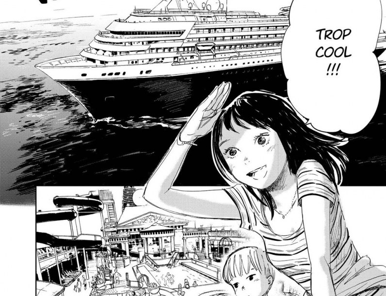 Bloody Cruise s’ouvre sur une scène crue et dérangeante, donnant le ton d’emblée : un repas mondain avec au centre de la table une jeune fille se faisant dévorer. L’ambiance est posée ! Passées ces sept premières pages difficiles à situer dans le temps, nous voici en présence de Satori, une (autre ?) jeune fille, tout sourire, heureuse d’entamer une croisière sur un grand paquebot avec son père et son petit frère. Ce dernier qui ne parle pas et passe son temps à s’enfuir, instaure immédiatement une atmosphère inquiétante dans ce cadre apparaissant pourtant comme idyllique. Rapidement, nous faisons la connaissance d’un autre jeune homme, visiblement pas insensible au charme de notre héroïne, et de son groupe d’amis dont les personnalités aussi différentes que complémentaires, les rendent tout de suite sympathiques.