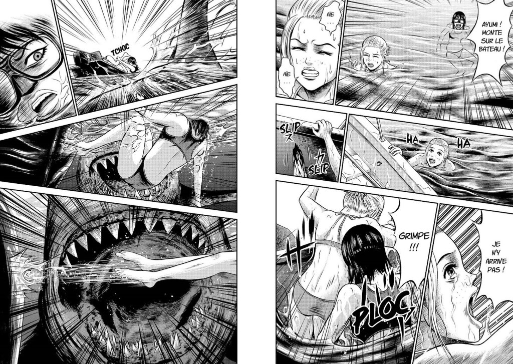 Il est vrai qu’on sourit aussi quand cette fichue corde à tout faire, arme ultime de nos compagnons, se prend malencontreusement dans l’hélice du moteur… et que c’est le gentil pote à la jambe fracassée qui bondit dans l’eau pour aller réparer le problème et qu’on lui envoie un si judicieux : « Sois prudent ! ». Merci Captain Obvious ! On va arrêter de spoiler ce manga sans grand intérêt mais nous ne résistons pas à l’envie de décerner la palme à cette pauvre fille qu’on abandonne lâchement sur une petite embarcation alors qu’elle se vide de son sang et à laquelle on conseille quand même, avec un reste d’empathie bien enfoui, de se faire un p’tit garot !