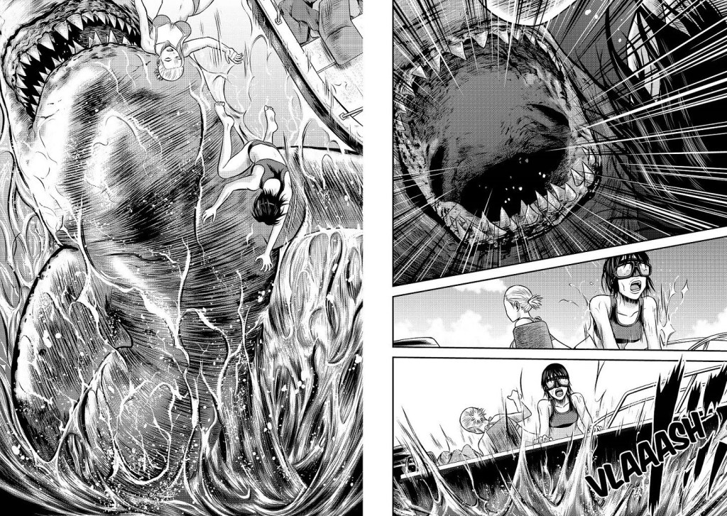 Bon eh bien clairement, il suffit pas d’aller bien loin dans sa lecture du manga pour comprendre que nous sommes face à un beau navet. Le contexte est posé rapidement : Kaito et ses amis du lycée qui ne se sont pas vus depuis six ans décident de se retrouver pour faire une petite virée en mer. L’un d’eux a emprunté en cachette un bateau dans la boîte dans laquelle il travaille (précision qui n’apporte rien à l’histoire, comme la grande majorité des infos que l’auteur distille ici et là) et décide de se prendre pour le capitaine de la petite troupe ; assez naturellement puisqu’il est le seul à avoir des connaissances sur la mer et la navigation. Suivi de sa troupe de boulets, notre chef entreprend donc d’arpenter les mers qui jadis ont abrité un énorme requin. Et comme on peut s’y attendre, ce monstre rôde toujours et ne va pas tarder à faire son apparition sous nos yeux non-ébahis pour se repaitre de cette troupe d’ados peu attachants et particulièrement idiots.