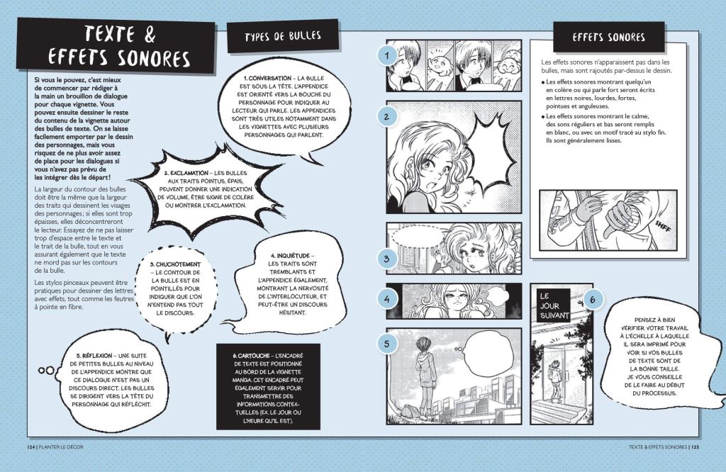 Ce qui frappe également, c’est sans conteste la place réservée aux conseils de tous types afin de réaliser au mieux ses propres mangas. Laura Watton semble avoir acquis des connaissances quais encyclopédiques dans le domaine et lesdits conseils sont réellement précieux. Ici on apprendra comment dessiner divers éléments (personnages, animaux, décors, mouvements), là on apprendra à structurer une narration de type manga. L’ouvrage est vraiment complet et le scope proposé est vraiment vaste. Ces trucs et astuces et conseils sont sans conteste la plus-value de cet ouvrage, tant ils semblent indispensables.