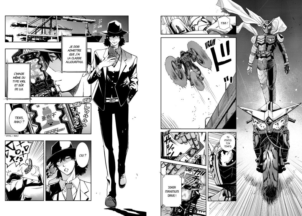Fuuto Pi c’est l’histoire d’un détective « doux à cuire » majoritairement sollicité pour retrouver des chats égarés alors qu’en vrai, il est super balèze, sacrément malin et doté d’un sixième sens redoutable, comme nous allons progressivement nous en rendre compte. Dans le tome 1, nous le suivons sur la piste d’une mystérieuse jeune femme dotée de pouvoirs surnaturels et accusée d’avoir commis différents crimes (certains plus gores que d’autres). L’enquête est donc cette fois-ci très sérieuse mais notre héros ne se laisse pas pour autant impressionner et met du cœur à l’ouvrage pour aider chacun de ses clients, que la mission soit risquée ou non. Il faut dire qu’au fond, il ne craint pas grand chose car, comme nous l’avons déjà évoqué, il est puissant et, qui plus est, ce n’est autre que le grand Kamen Rider qui veille sur la ville de Fuuto dans l’ombre, avec son acolyte avec lequel il peut fusionner pour prendre différentes formes.