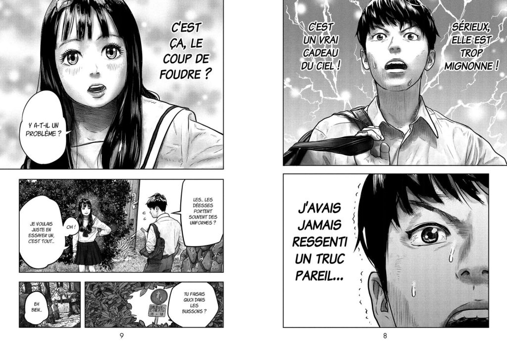 En ouvrant ce premier tome, il est difficile de croire que le mangaka en est à son coup d’essai. Les décors, très détaillés et soignés, s’offrent régulièrement des doubles pages de toute beauté. L’univers bercé par le folklore japonais et emprunt d’un mysticisme plein de charme, est retranscrit à merveille à travers les dessins. Il suffit alors de faire quelques recherches pour apprendre que si Fumitaka Katô maîtrise autant son sujet, c’est qu’il a, par le passé, fait ses preuves dans le design d’intérieur et le jeu vidéo. Pas de doute, son coup de crayon est maitrisé…du moins pour les arrières-plans. En effet, les personnages, perdus dans ces décors foisonnant de détails, semblent, eux, particulièrement lisses et peu expressifs ; et malheureusement, c’est là que le bât blesse. Enchantée tout d’abord par le visuel, je suis allée de déception en déception quant à l’histoire qui s’est avérée être plus insipide qu’un bout de tofu. Celle-ci met en scène un jeune adolescent portant le nom de Jûzô Shiba, qui tombe par hasard sur une jolie déesse en tenue d’écolière (oui, oui, cela n’a pas de sens), coincée dans un arbuste depuis « des milliers d’années », rien que ça ! Notre héros qui, on ne sait pourquoi, a le don de voir l’invisible, va donc venir en aide très facilement à cette charmante déesse et la libérer. Il va alors tomber instantanément amoureux d’elle et les deux protagonistes vont décider de se marier.