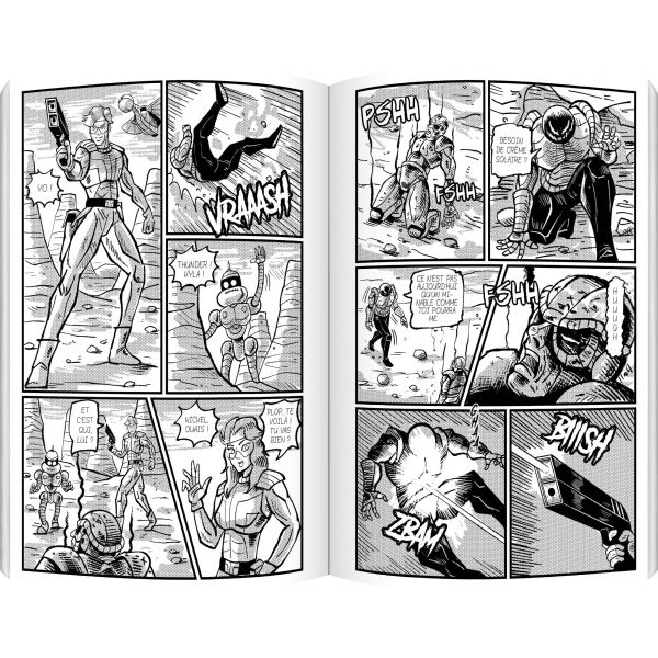 Ce qu’on aime, d’entrée de jeu, dans Omega 6, c’est que l’auteur nous plonge directement dans son univers. Pas de présentations insipides, ni d’explications barbantes, l’histoire commence in medias res. Les deux héros, un gars prénommé Thunder et une nana du nom de Kyla, flottent dans une espèce de tube rempli de liquide, dans l’espace. On apprend rapidement que cela leur permet de rester jeunes et en pleine possession de leurs forces. Bien pratique, surtout que ces deux-là sont tout de suite amenés à se battre pour combattre un méchant au look falconesque sur une planète lointaine. Cette ambiance SF, apporte son lot de créatures amusantes, comme le conducteur du vaisseau des personnages principaux, sorte de grosse mouche qui jure comme un charretier du Sud avec des « Boudiou ! » et n’aime pas qu’on l’interrompe dans sa partie sur son téléphone pour lui demander de venir sauver les miches de ses compagnons. L’humour grotesque ne plaira pas à tout le monde mais l’auteur n’en fait jamais trop et ces touches de légèreté permettent au récit de ne pas sombrer dans une SF pompeuse qui se prendrait trop au sérieux.