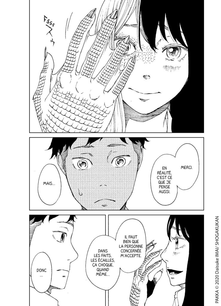 Pakka continue sur sa belle lancée et nous enveloppe dans un océan de tendresse, d’humour et de mélancolie. Le mangaka sait toucher son lecteur par son histoire et ses dessins emprunts de légèreté et de douceur. C’est un régal de parcourir ces pages et l’édition est encore une fois de toute beauté (mention spéciale pour les écailles en relief sur l’intérieur de la couverture du tome 3 !). Vivement la suite !