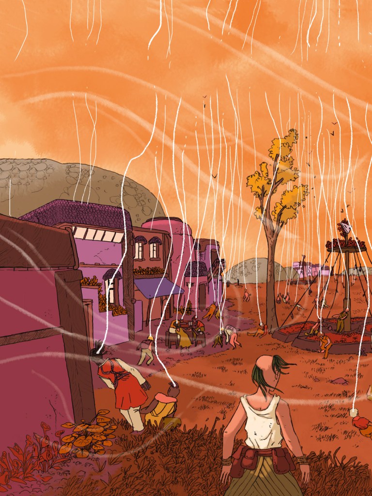 Des créatures gigantesques, considérées comme des divinités, rythment les saisons. Hang, incarnant la fertilité, revient périodiquement dans le cadre d’une célébration. Mais cette fois sa venue se fait attendre et Avine perd tous les siens, famille comme habitants de son village, probablement par la faute d’Orgue, autre immense créature. Elle échappe à un sort funeste grâce à l’absorption d’une sève par son organisme, et se met à la recherche de Hang et de son frère.