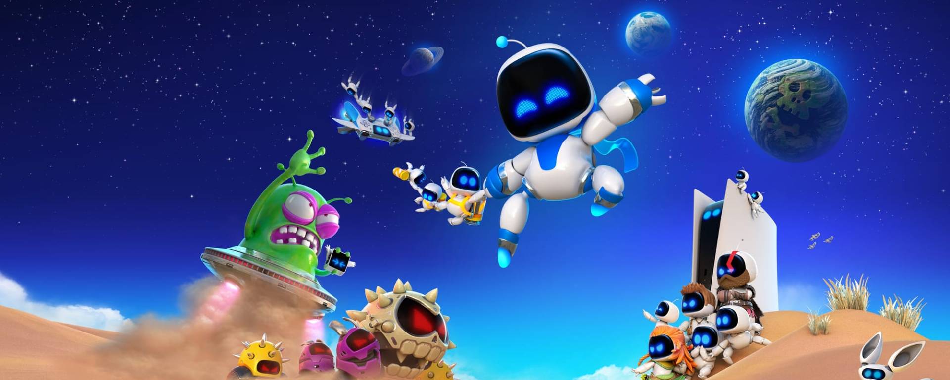 Un alien aussi cliché que belliqueux réduit le vaisseau-PlayStation 5 d’Astro Bot en morceaux. Ce dernier doit en récupérer les composants en traversant divers niveaux de galaxies lointaines, tout en libérant un maximum de bots lui permettant de débloquer de nouvelles zones. Tel est le pitch du dernier titre du studio tokyoïte Team Asobi.